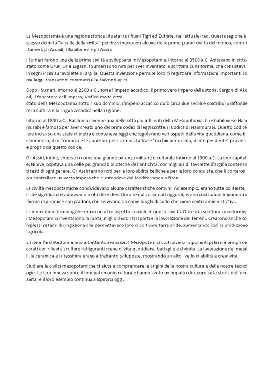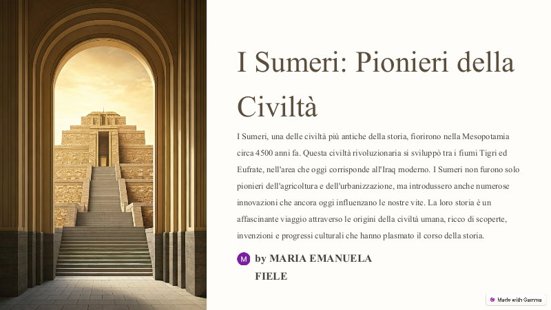 I Sumeri, uno dei popoli più antichi della storia, hanno dato origine a una delle prime civiltà conosciute, nella regione della Mesopotamia, tra i fiumi Tigri ed Eufrate, circa 4500 anni fa. I Sumeri non sono solo noti per essere stati pionieri dell'agricoltura e dell'urbanizzazione, ma anche per aver sviluppato molte delle innovazioni che ancora oggi influenzano le nostre vite.