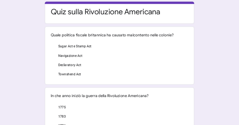Die Datei kann in Ihrem Browser nicht geöffnet werden, weil JavaScript nicht aktiviert ist. Aktivieren Sie JavaScript und laden Sie die Seite noch einmal. Quiz sulla Rivoluzione Americana In Google anmelden , um den Fortschritt zu speichern. Weitere Informationen Quale politica fiscale britannica ha causato malcontento nelle colonie? Sugar Act e Stamp Act Navigazione Act Declaratory Act Townshend Act Auswahl löschen In che anno iniziò la guerra della Rivoluzione Americana? 1775 1783 1776 1781 Auswahl löschen Chi era il comandante principale delle forze americane? Thomas Jefferson George Washington Benjamin Franklin John Adams Auswahl löschen Quale battaglia è considerata una delle prime della guerra? Battaglia di Yorktown Battaglia di Lexington e Concord Battaglia di Saratoga Battaglia di Bunker Hill Auswahl löschen Chi redasse la Dichiarazione d'Indipendenza? Thomas Paine George Washington John Adams Thomas Jefferson Auswahl löschen Quale nazione si alleò con le colonie americane nel 1778? Spagna Francia Paesi Bassi Germania Auswahl löschen Quale battaglia segnò la fine della guerra? Battaglia di Saratoga Battaglia di Bunker Hill Battaglia di Yorktown Battaglia di Lexington e Concord Auswahl löschen In che anno fu firmato il Trattato di Parigi? 1776 1781 1783 1785 Auswahl löschen Quali idee politiche furono promosse dalla rivoluzione? Monarchia assoluta Libertà individuale e governo rappresentativo Feudalesimo Teocrazia Auswahl löschen Quale rivoluzione fu ispirata dalla Rivoluzione Americana? Rivoluzione Industriale Rivoluzione Francese Rivoluzione Russa Rivoluzione Cinese Auswahl löschen Senden Alle Eingaben löschen Dieser Inhalt wurde nicht von Google erstellt und wird von Google auch nicht unterstützt. Missbrauch melden - Nutzungsbedingungen - Datenschutzerklärung Formulare