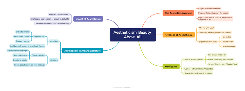 The Aesthetic Movement rejected traditional views that art should teach lessons or reflect reality. Instead, it celebrated creativity, imagination, and the pursuit of beauty. The motto of this movement was "art for art’s sake," meaning art did not need to have a functional or educational purpose. Artists experimented with new styles, vibrant colors, and detailed designs to make art visually appealing.