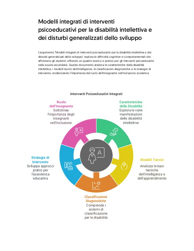 La prima parte del documento introduce il concetto di disabilità intellettiva, descritta come una condizione caratterizzata da limitazioni significative nel funzionamento cognitivo e nel comportamento adattivo, con esordio durante lo sviluppo. Viene sottolineato come questa condizione non sia una malattia, ma un insieme di difficoltà che possono variare in base all'ambiente e al supporto ricevuto. Le cause possono essere genetiche, biologiche o ambientali, e la diagnosi si basa su test standardizzati come il quoziente intellettivo (QI) e la valutazione delle abilità adattive.