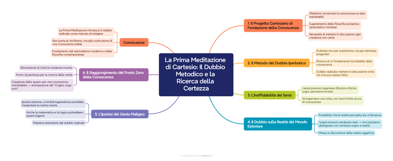 Giunto a questo punto, Cartesio si trova in una condizione di dubbio radicale, in cui ogni conoscenza precedente è stata messa in discussione. Tuttavia, questa demolizione sistematica del sapere non è fine a se stessa: essa ha lo scopo di individuare una verità indubitabile, un principio primo su cui poter costruire un sistema filosofico solido. La successiva Seconda Meditazione segnerà la scoperta di tale principio: il celebre "Cogito, ergo sum".