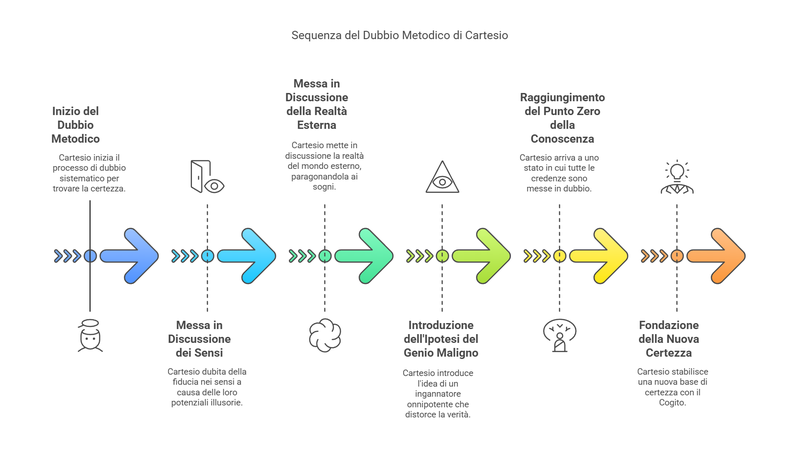Per spingere il dubbio al massimo grado, Cartesio introduce la celebre ipotesi del "genio maligno", un'entità potentissima e ingannatrice che potrebbe farci credere a verità illusorie. Anche le conoscenze matematiche, apparentemente certe, potrebbero essere frutto di un inganno sistematico. Questa ipotesi estrema segna il culmine del dubbio cartesiano: nulla di quanto finora creduto può essere considerato indubitabile.
