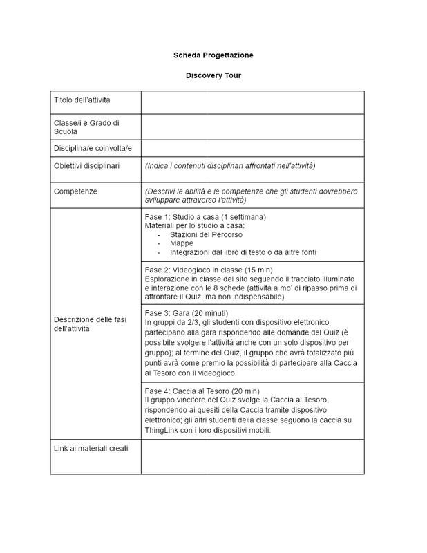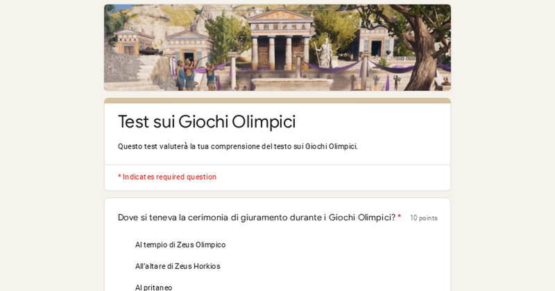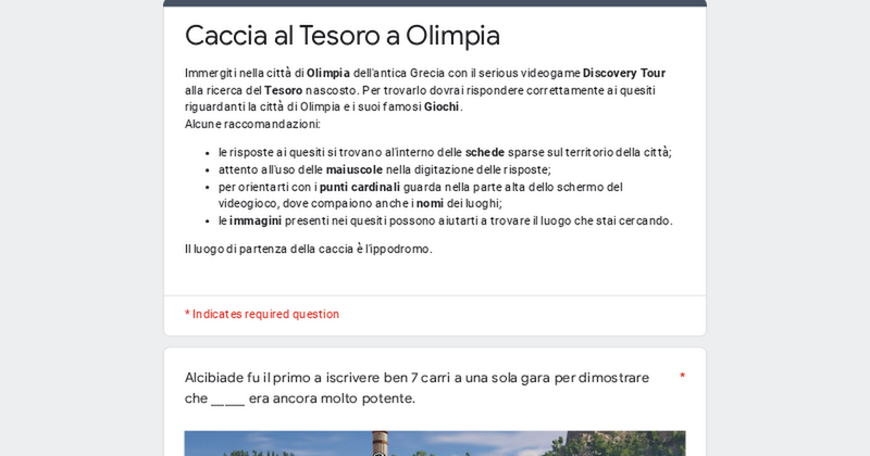 Immergiti nella città di Olimpia dell'antica Grecia con il serious videogame Discovery Tour alla ricerca del Tesoro nascosto. Per trovarlo dovrai rispondere correttamente ai quesiti riguardanti la città di Olimpia e i suoi famosi Giochi. Alcune raccomandazioni: le risposte ai quesiti si trovano al'interno delle schede sparse sul territorio della città; attento all'uso delle maiuscole nella digitazione delle risposte; per orientarti con i punti cardinali guarda nella parte alta dello schermo del videogioco, dove compaiono anche i nomi dei luoghi; le immagini presenti nei quesiti possono aiutarti a trovare il luogo che stai cercando. Il luogo di partenza della caccia è l'ippodromo.