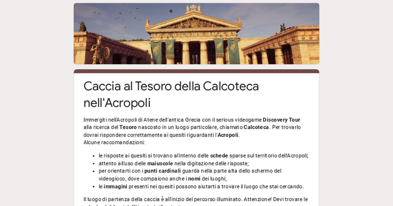 Immergiti nell'Acropoli di Atene dell'antica Grecia con il serious videogame Discovery Tour alla ricerca del Tesoro nascosto in un luogo particolare, chiamato Calcoteca. Per trovarlo dovrai rispondere correttamente ai quesiti riguardanti l'Acropoli. Alcune raccomandazioni: le risposte ai quesiti si trovano al'interno delle schede sparse sul territorio dell'Acropoli; attento all'uso delle maiuscole nella digitazione delle risposte; per orientarti con i punti cardinali guarda nella parte alta dello schermo del videogioco, dove compaiono anche i nomi dei luoghi; le immagini presenti nei quesiti possono aiutarti a trovare il luogo che stai cercando. Il luogo di partenza della caccia è all'inizio del percorso illuminato. Attenzione! Devi trovare le schede al di fuori dell'itineriario illuminato. Buona Caccia!