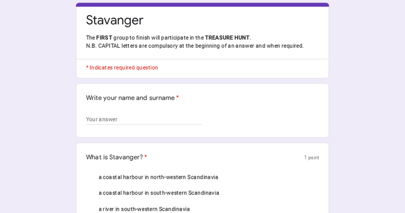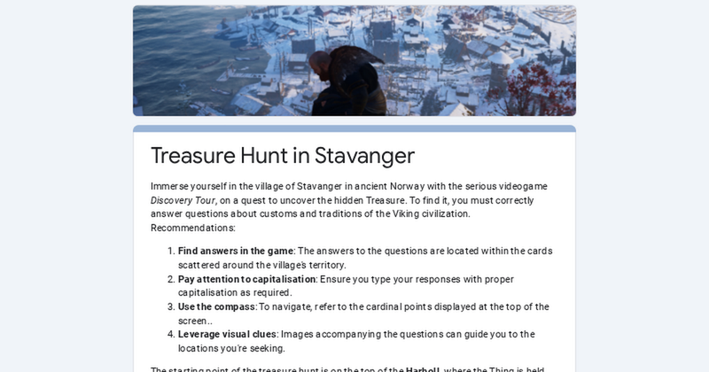 Immerse yourself in the village of Stavanger in ancient Norway with the serious videogame Discovery Tour, on a quest to uncover the hidden Treasure. To find it, you must correctly answer questions about customs and traditions of the Viking civilization. Recommendations: Find answers in the game: The answers to the questions are located within the cards scattered around the village's territory. Pay attention to capitalisation: Ensure you type your responses with proper capitalisation as required. Use the compass: To navigate, refer to the cardinal points displayed at the top of the screen.. Leverage visual clues: Images accompanying the questions can guide you to the locations you're seeking. The starting point of the treasure hunt is on the top of the Harholl, where the Thing is held. GOOD LUCK!