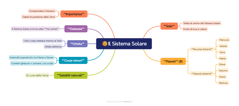 Il Sistema Solare è formato da una stella, il Sole, e da tutti i corpi celesti che gli ruotano intorno grazie alla forza di gravità. Tra questi ci sono otto pianeti: Mercurio, Venere, Terra, Marte, Giove, Saturno, Urano e Nettuno. I primi quattro, più vicini al Sole, sono rocciosi; gli ultimi quattro sono giganti gassosi.