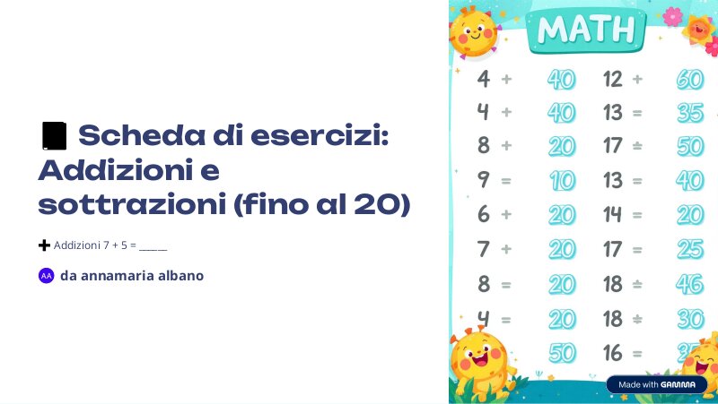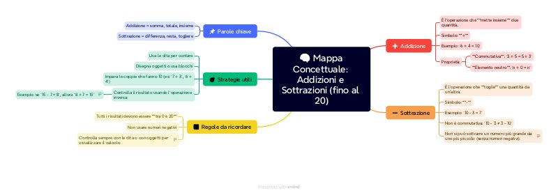 Ecco una serie di esercizi di addizioni e sottrazioni adatti a bambini di prima primaria (6 anni), con numeri da 1 a 20. Tutti i risultati sono compresi tra 1 e 20 (nessun numero negativo o superiore a 20).
